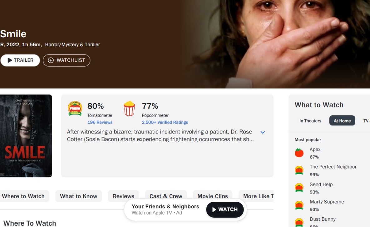 Critics were also riding a wave of “elevated trauma horror” after Hereditary, It Follows, and The Babadook, and Smile fit neatly into that ecosystem while being more mainstream and jump-scare friendly.