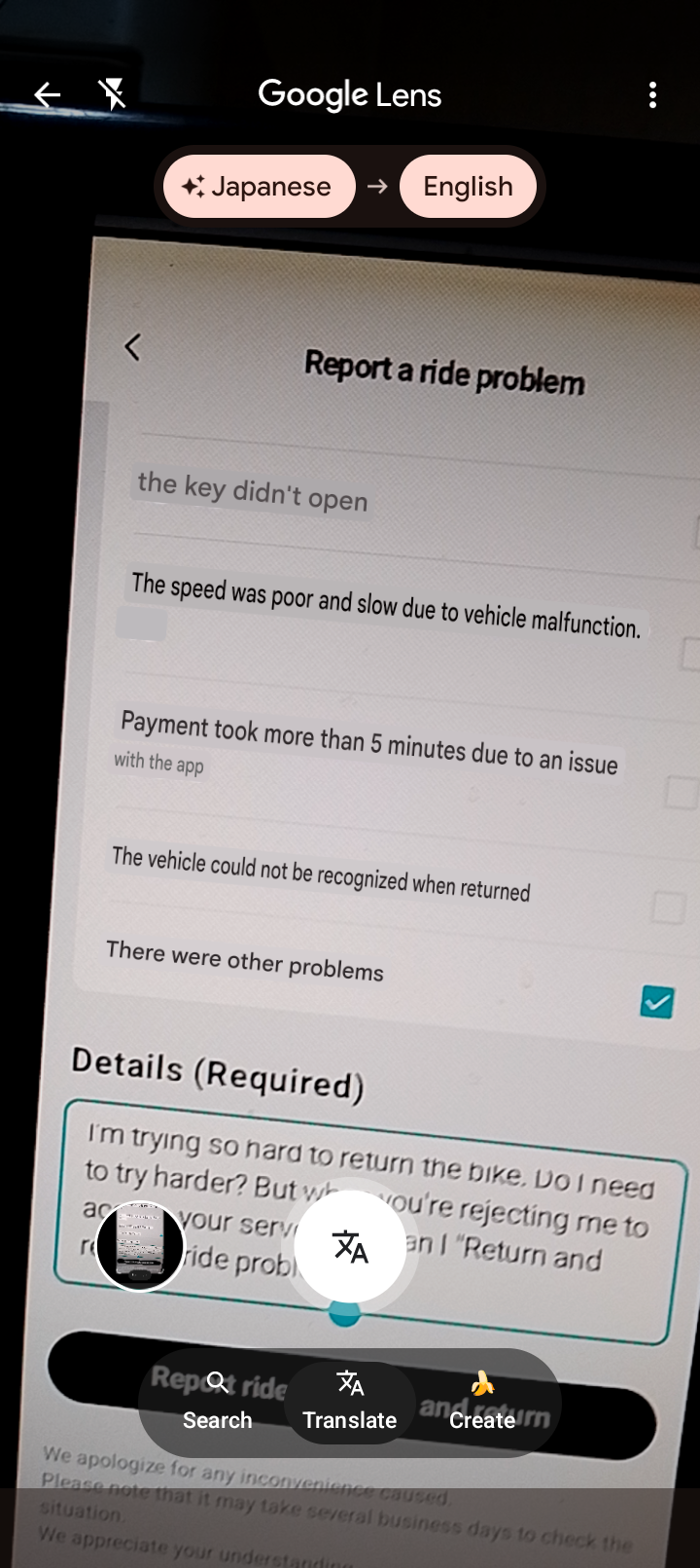 バイクを返却しようと必死に操作しているのに、「もう一度試してください」と永遠に表示され続けます。