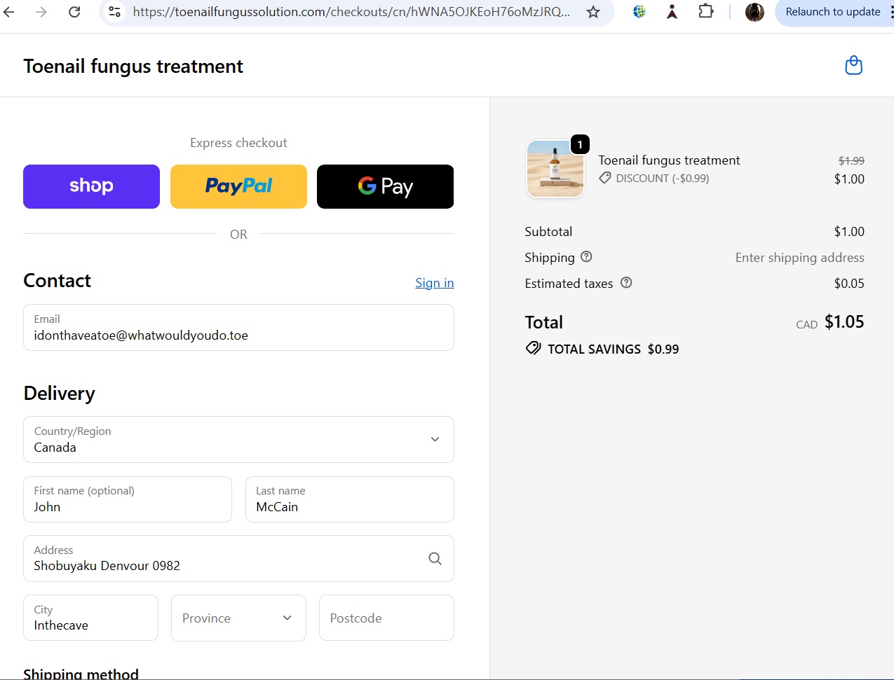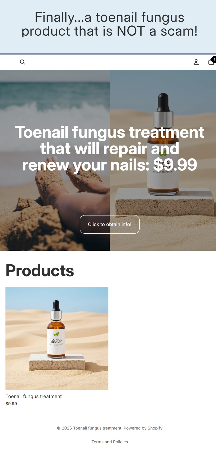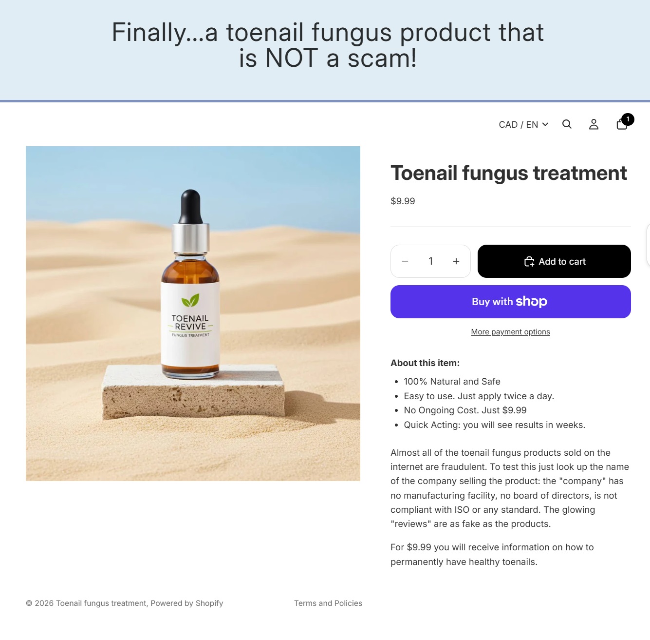 It’s screaming “NOT a scam!” in giant letters at the top of their website lol. It was first observed on Mar 21, 2026, in my YouTube feed (previous report), and has now evolved into an overt sleazy PDF seller with the precise description of what they sell. It’s not a toenail fungus treatment in a fancy dropper bottle, but an idea of a treatment. Thank you for the clarification.