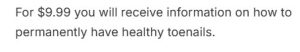 For $9.99 you will receive information on how to permanently have healthy toenails.”